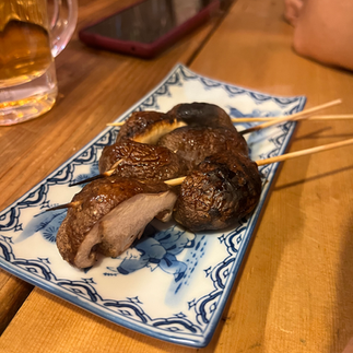We weren't quite full or ready to leave this wild environment so we added skewers of donko shiitake mushrooms, thick cut green onions, and chicken skins. While the veggies weren't quite cooked all the way through, the chicken skins were the stuff of dreams––dripping with chicken fat with toothsome chew punctuated by crispy edges.